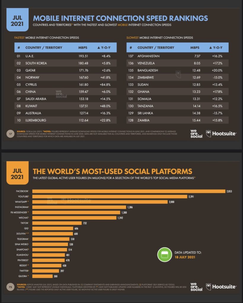 classement de vitesse de connexion internet mobile et les plateformes sociales les plus utilisées au monde