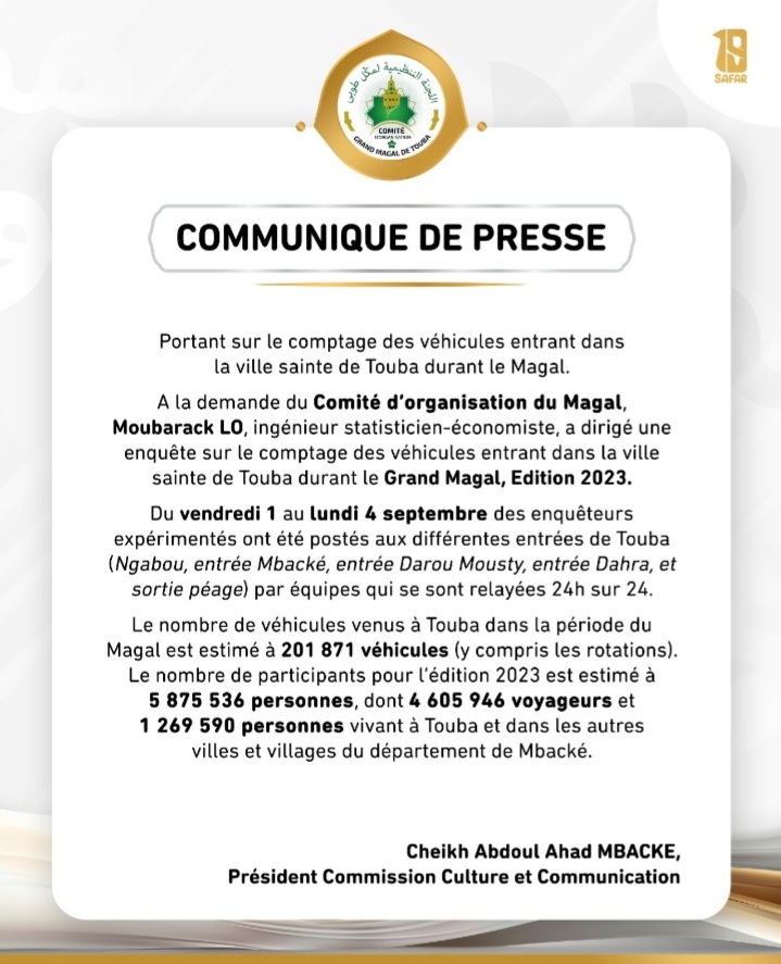 «5 875 536 personnes ont assisté au Magal de 2023. Chiffre record ! Une enquête commanditée par le comité d’organisation conduit par Moubarack Lo a conclu que 5 875 536 personnes ont assisté au Magal de 2023. Ce qui constitue un record», détaille Cheikh Abdoul Ahad Mbacké Gaindé Fatma, président de la commission culture et communication du Magal. Il rappelle qu’en 2015, 4 119 551 personnes avaient assisté au Magal.