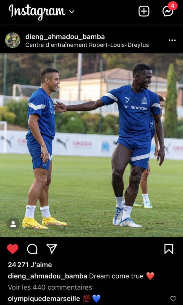 Bien qu’étant dans une mauvaise posturare avec son club de l’Olympique de Marseille, Cheikh Ahmadou Bamba Dieng, l’enfant qui rêvait depuis bas âge dans les rues de son quartier vient de réaliser cette utopie. Porter le même maillot que son idole de toujours et s’entraîner dans la même équipe lui. C’était un des rêves du jeune international sénégalais, Bamba Dieng. Cela, il l’a réalisé aujourd’hui avec Alexis Sanchez, la toute nouvelle recrue de l’Olympique de Marseille, au Centre d’entraînement Robert Louis-Dreyfus.