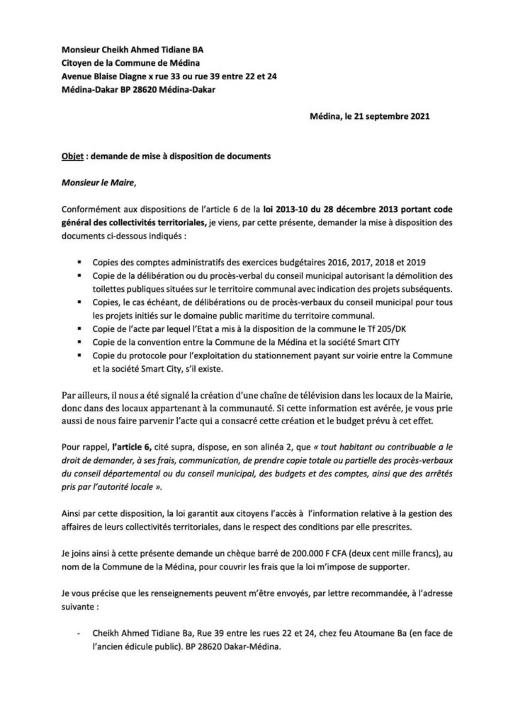 Conformément aux dispositions de l’article 6 de la loi 2013-10 du 28 décembre 2013 portant code général des collectivités territoriales, je viens, par cette présente, demander la mise à disposition des documents ci-dessous indiqués: