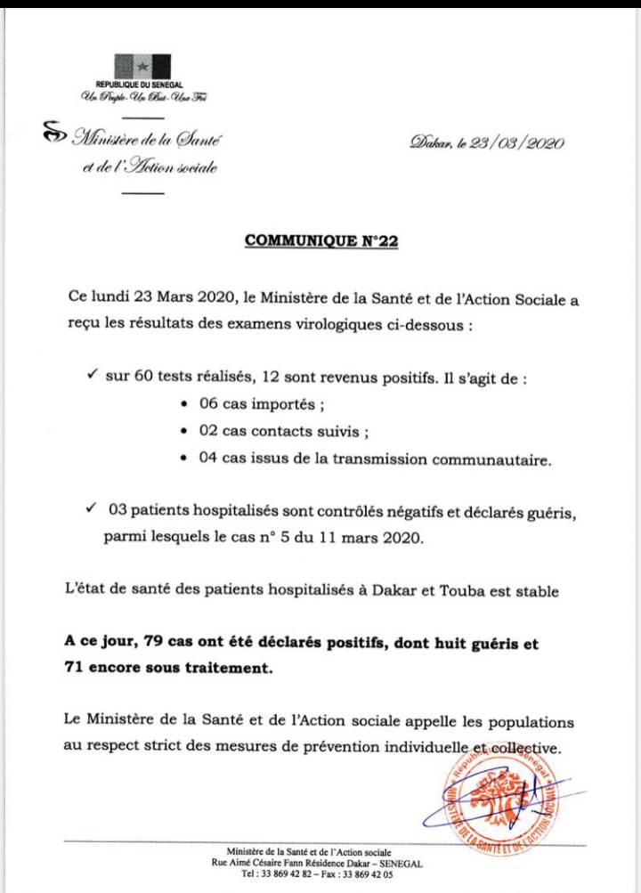 À ce jour, 79 ont été déclarés positif. Le ministère de déclarer que 8 sont guéris dont le premier sénégalais atteint du coronavirus qu’est le Modou-modou venu d’Italie.