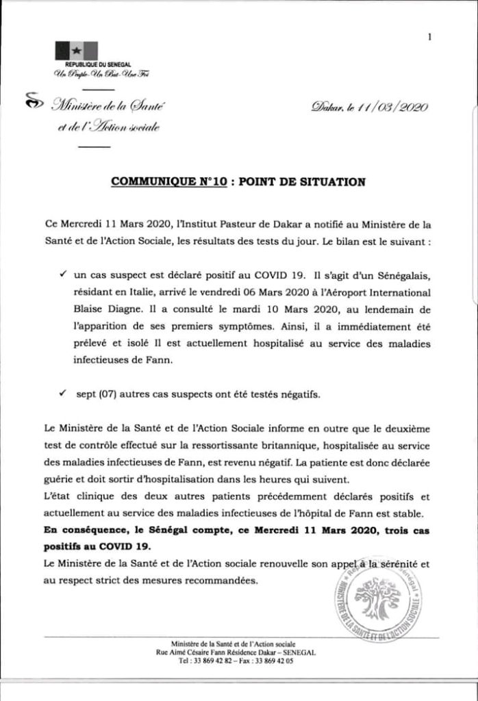 Il s’agit d’un deuxième cas de Coronavirus guéri par les médecins sénégalais. Le ministère de la Santé et de l’Action sociale dans son communiqué N°10 informe qu’au-delà du nouveau cas enregistré, l’Institut Pasteur a confié que les tests effectués sur le cas britannique sont revenus au négatif. La patiente de 38 ans va donc rentrer sous peu…