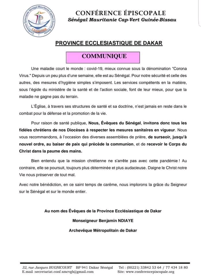 Face à la propagation du Coronavirus dans le monde et les cas déclarés au Sénégal, l’église a décidé de s’adresser aux fidèles chrétiens. Au nom des Évêques de la Province Ecclésiastique de Dakar, Monseigneur Benjamin Ndiaye appelle au respect des mesures sanitaires en vigueur. Il appelle aussi à surseoir jusqu’à nouvel ordre certaines assemblées…