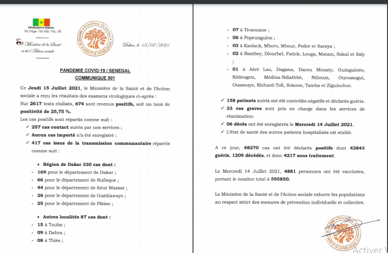 A ce jour, le Sénégal compte 48270 cas positifs dont 42843 guéris, 1209 décès et 4217 patients encore sous traitement.