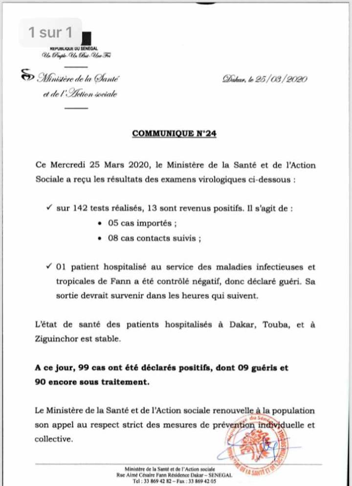 Ledakarois221- Le Sénégal enregistre 13 nouveaux cas du Covid-19. Dans sa communication numéro 24 de ce Mercredi 25 Mars 2020, le ministère de la Santé et de l’Action sociale confie qu’il s’agit de 5 cas importés et 9 cas guéris et 90 en traitement.
