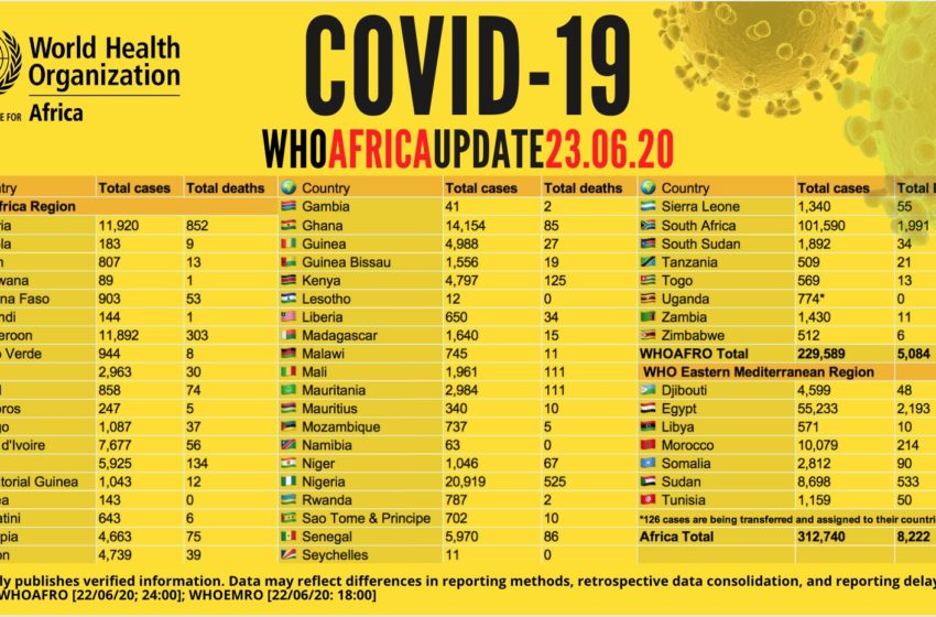 L’Afrique recense ce mardi 23 juin 316 502 cas confirmés du nouveau coronavirus, pour 151 411 guérisons. La pandémie a déjà fait 8 353 victimes sur le continent. Les cinq pays les plus touchés par la Covid-19 sont l’Afrique du Sud (101 590 cas), l’Égypte (56 809), le Nigeria (20 919), le Ghana (14 568) et l’Algérie (11 920).