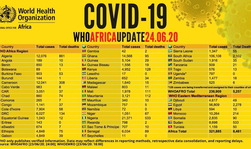 L’Afrique recense ce mercredi 24 juin 324 524 cas confirmés du nouveau coronavirus, pour 154 320 guérisons. La pandémie a déjà fait 8 621 victimes sur le continent. Les cinq pays les plus touchés par la Covid-19 sont l’Afrique du Sud (106 108 cas), l’Égypte (58 141), le Nigeria (21 371), le Ghana (14 568) et l’Algérie (12 076).