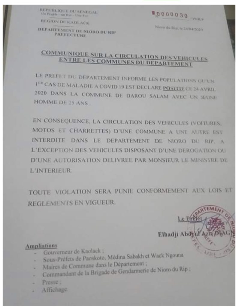 L’information vient d’être confirmée par le Préfet du département, M. Abdoul Aziz Daigne précise qu’il s’agit d’un jeune homme, âgé de 25 ans, a été testé positif au Covi -19 dans la commune de Darou Saloum, département de Nioro, région de Kaolack. L’autorité a profité de l’occasion pour sortir un arrêté qui interdit formellement le déplacement inter- communal dans la zone.