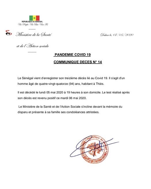 Le Sénégal vient d’enregistrer son treizième décès lié au Coronavirus il s’agit d’un homme de 94 ans habitant à Thiès