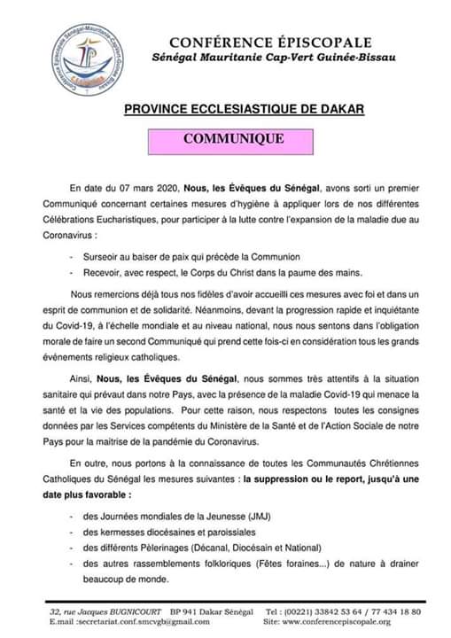 En atteste le communiqué de la province ecclésiastique de Dakar