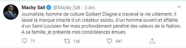 « Journaliste, homme de culture Golbert Diagne a traversé la vie utilement. Il laisse la marque intacte d’un créateur assidu, d’un homme ouvert et affable, d’un Saint-Louisien fier mais profondément pénétré des valeurs de la Nation. A sa famille, je présente mes condoléances émues » , a-t-il écrit.