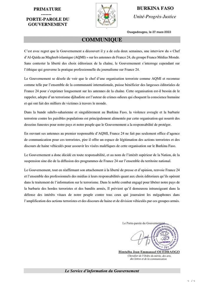 Suspendue au Burkina pour avoir fait de la propagande aux terroristes, France24 «déplore vivement» la décision et «conteste les accusations sans fondement qui mettent en cause» son «professionnalisme». «Jamais la chaîne n’a donné la parole directement» au chef d’Aqmi,dit-elle