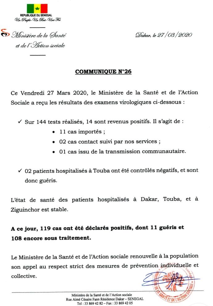 Dans sa communication numéro 26 du vendredi 27 mars 2019, le ministère de la Santé et de l’Action sociale annonce 14 nouveaux cas positifs au Sénégal. Il s’agit selon Abdoulaye Diouf Sarr de 11 cas importés, 2 cas contacts suivis et 1 cas issu de la transmission communautaire. Le Sénégal enregistre aussi ce jour, 2 cas guéris à Touba.