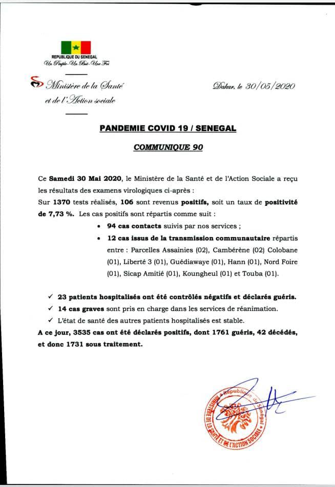 Ledakarois221- Dans sa communication de ce Samedi 30 mai 2020, le ministère de la Santé et de l’Action sociale nous apprend que le Sénégal a enregistré ce jour sur 1370 tests, 106 nouveaux cas de contamination au Coronavirus. 12 cas communautaires ont été recensés. Dakar reste la zone la plus touchée par la maladie…