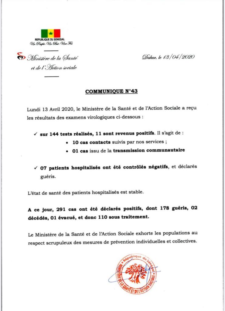 Dans sa communication du jour, le ministère de la Santé et de l'Action sociale informe que le Sénégal a enregistré ce Mardi 14 avril 2020, 8 nouveaux cas positifs et 5 patient guéris. Les détails avec le Communiqué parvenu à la redaction.
