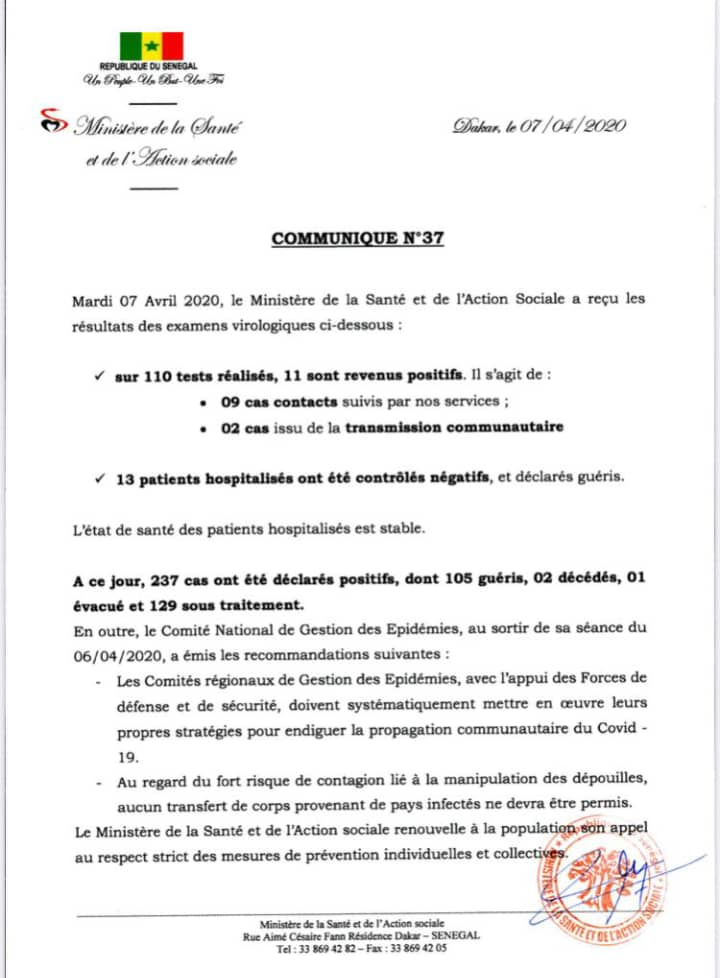 Ledakarois221- Dans sa communication numéro 37, le ministère de la Santé et de l'Action sociale a confié que le Sénégal a enregistré ce jour 11 nouveaux cas positifs. Voici les détails