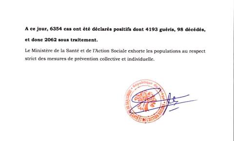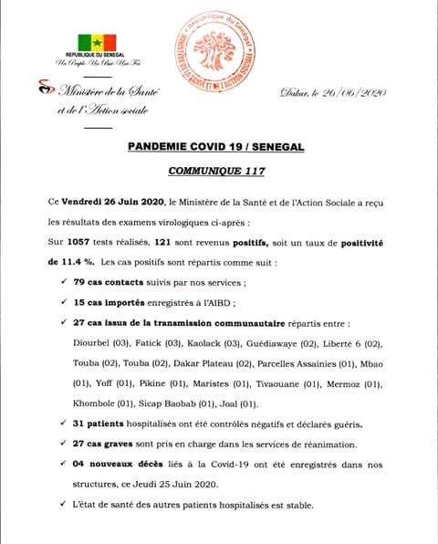 Ledakarois221- Dans sa communication de ce Vendredi 26 juin 2020, le ministère de la Santé et de l’Action sociale a annoncé 121 nouveaux cas. .4 décès, 15 cas importés à l'AIBD et 27 patients en réanimation