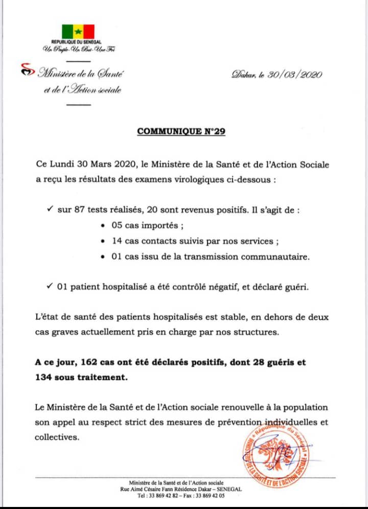 Dans sa communication numéro 29, le ministère de la Santé informe que le Sénégal a enregistré ce jour, 20 nouveaux cas. Il s'agit de 5 cas importés, 14 cas contacts suivis, 1 cas issu de la transmission communautaire.