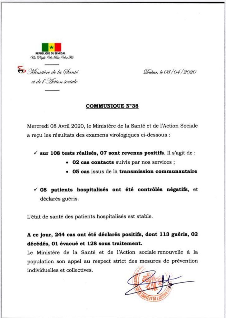 Ledakarois221- Dans sa communication numéro 39, le ministère de la Santé et de l’Action sociale a confié que le Sénégal a enregistré ce jour 7 nouveaux cas positifs. Il s’agit de 2 cas contacts suivis et 5 cas issus de la transmission communautaire. Le Dr Aloyse Waly Diouf a aussi annoncé qu’à ce jour 5 patients sont guéris.