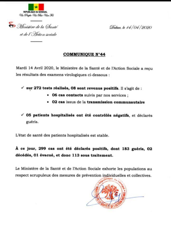 Ledakarois221- Dans sa communication du jour, le ministère de la Santé et de l'Action sociale informe que le Sénégal a enregistré ce Mardi 14 avril 2020, 8 nouveaux cas positifs. plus de détails dans le document ci-aprés....