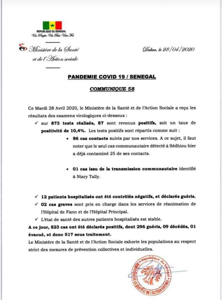 Ledakarois221- Dans son communiqué numéro 58 de ce Mardi 28 Avril, le ministère de la Santé et de l’Action sociale a confié que le Sénégal a enregistré ce jour 87 cas positifs 12 guéris avec un cas communautaire. Les détails dans le document ci après