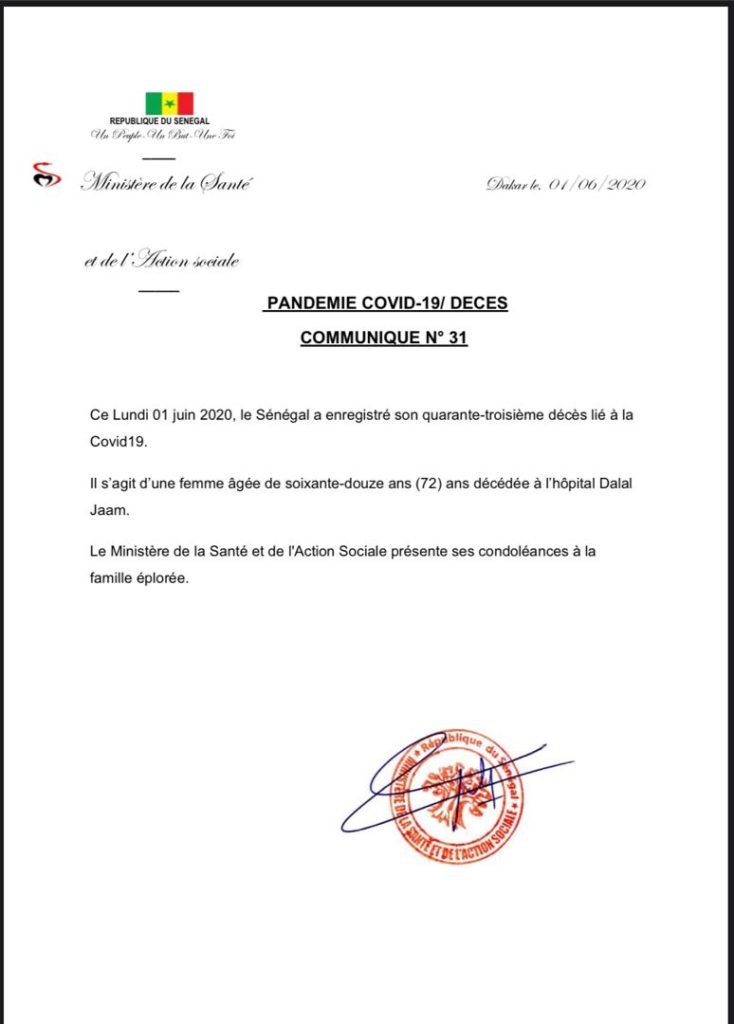 Ledakarois221- Le Sénégal vient d'enregistrer un 43ième décès lié à la Covid-19. Il s'agit d'un homme de 72 ans.