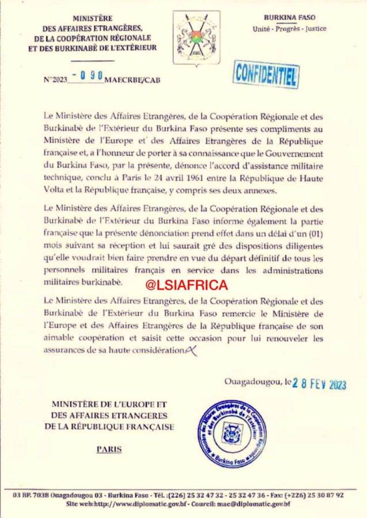 La junte au pouvoir au Burkina a dénoncé mardi «l’accord d’assistance militaire technique conclu entre la Haute-Volta et la France le 24/04/1961. La France a un mois pour le départ définitif de tous ses personnels militaires en service dans les administrations militaires Burkinabè. LSI Africa.