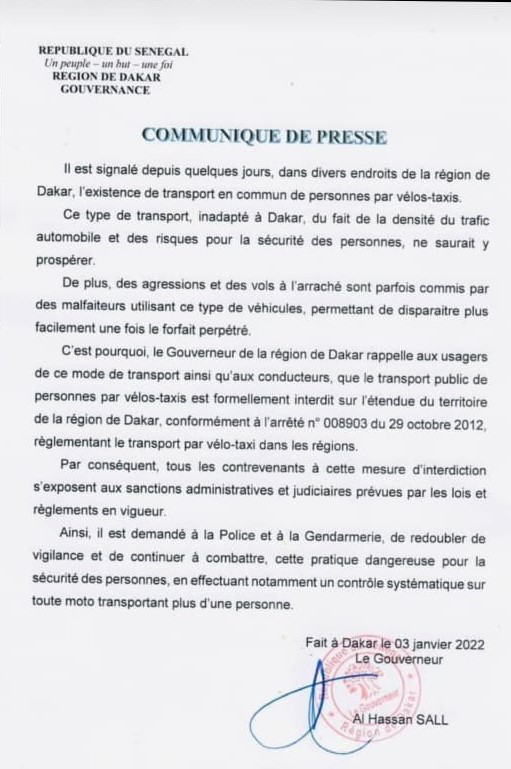 Dans son communiqué de presse, le gouverneur rappelle que des agressions et des vols à l’arraché sont parfois commis par des malfaiteurs utilisant ce type de véhicule, permettant de disparaître plus facilement une fois le forfait perpétrés. C’est pourquoi,le transport public de personnes par vélo–taxis est formellement interdit à Dakar.