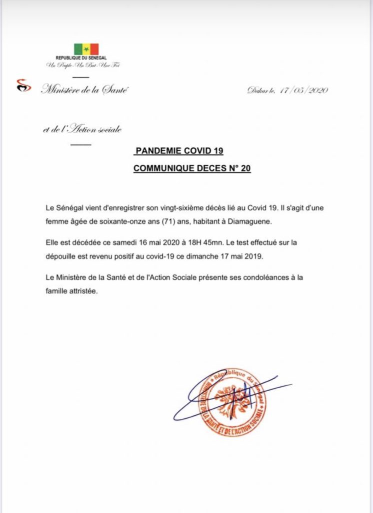 Le Sénégal enregistre son 26e décès lié au Covid-19 il s’agit d’une femme de 71 ans habitant Diamaguene. Décès survenu le samedi 16 et le test effectué sur la dépouille est revenu positif ce dimanche 17 Mai 2020