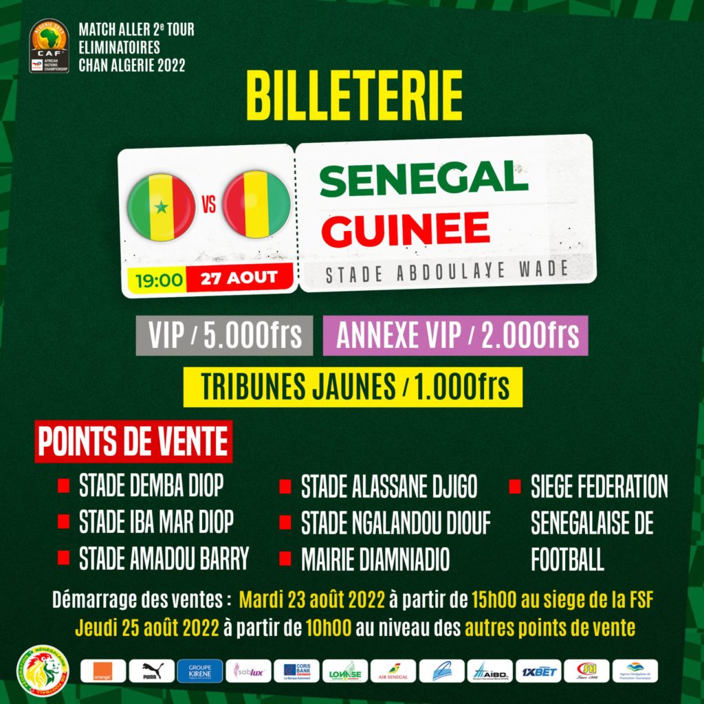 Pour retourner à ce niveau, il faudra que les Lions locaux battent la Guinée. Ce voisin redoutable qui sera à Dakar le 27 août prochain pour le match aller. La rencontre est prévue à 19 heures au stade Abdoulaye-Wade. Et la Fédération Sénégalaise de Football a communiqué sur les prix des billets. 1000 FCFA, 2000 FCFA et 5000 FCFA sont les prix indiqués selon les catégories. La vente des billets va démarrer 3 jours avant l’événement.