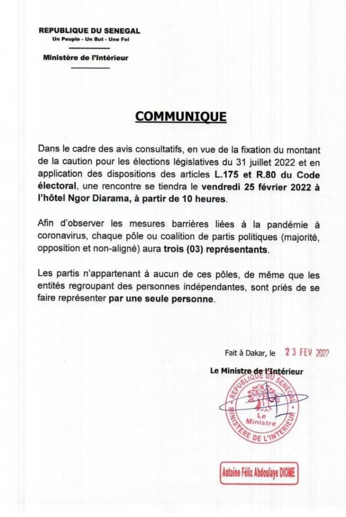 Dans le cadre des avis consultatifs, en vue de la fixation du montant de la caution pour les éléctions législatives du 31 juillet 2022 et en application des dispositions des articles L.175 et R.80 du Code éléctoral.