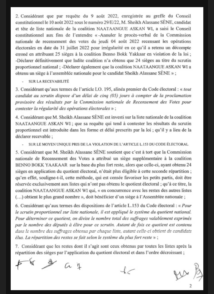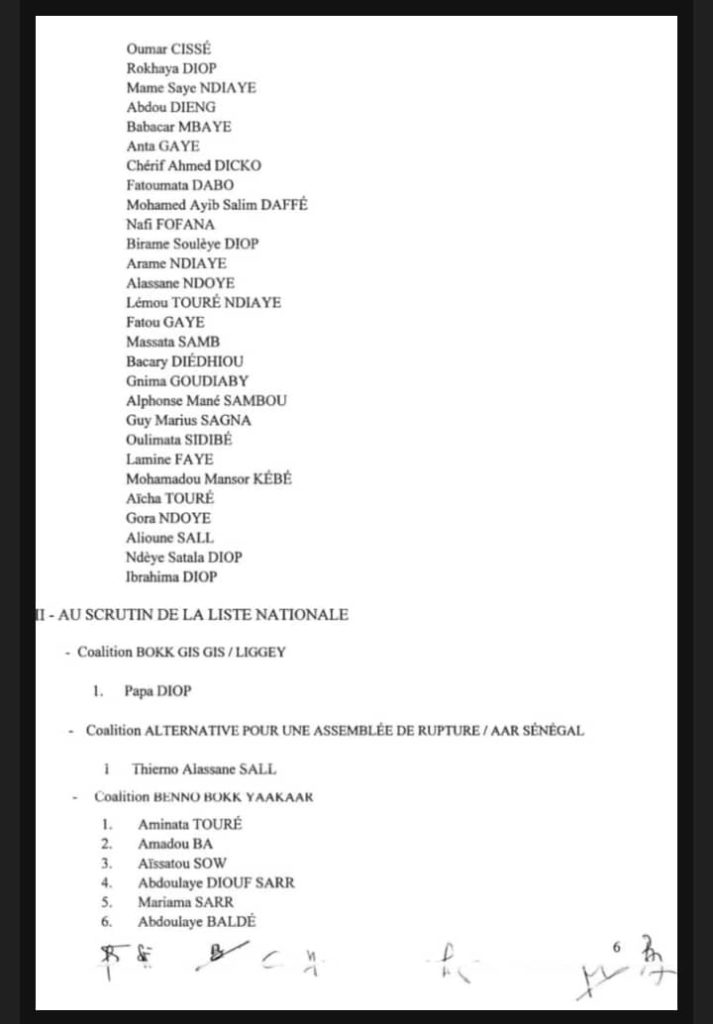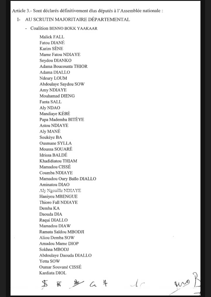 Ces résultats sont identiques aux résultats provisoires publiés par la Commission nationale de recensement des votes. Il s’y ajoute seulement un recours de Cheikh Alassane Sène, candidat de la coalition Natangué Askan Wi, qui conteste le nombre de sièges obtenu par BBY. Recours, qui sera finalement rejeté par les sept (7) sages.