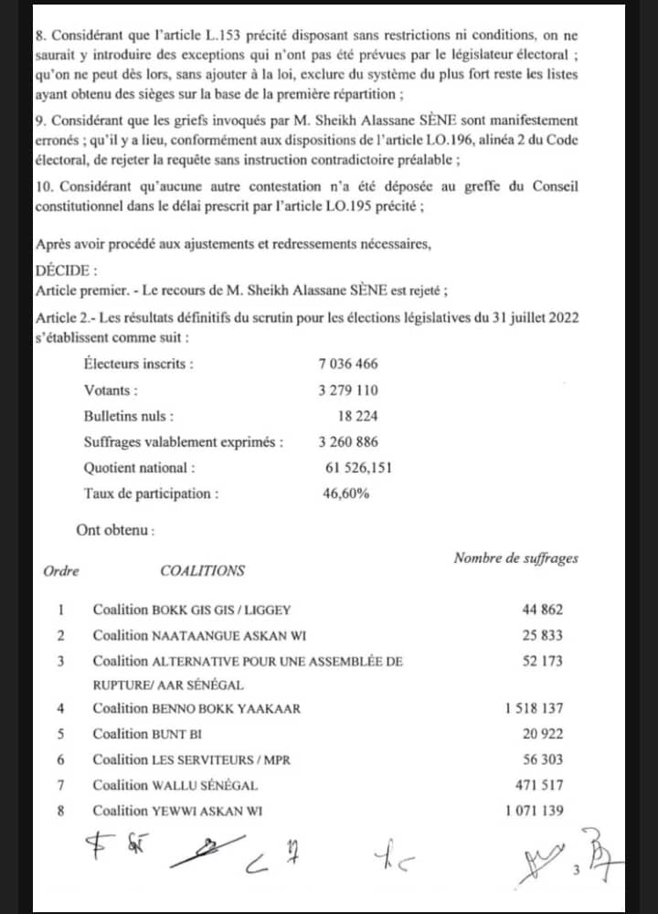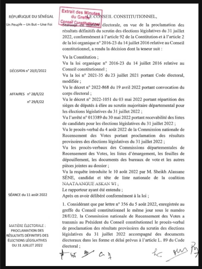 Le Conseil constitutionnel sénégalais a publié, ce jeudi, les résultats définitifs des élections législatives du 31 juillet 2022.