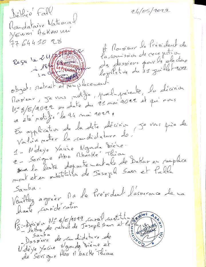 “En application de la décision N 8/E/2022 du conseil constitutionnel, je me suis déplacé à la DGE pour procéder aux retraits et remplacements des candidatures de Joseph Sarr et Palla Samba. Je leur ai également remis la nouvelle liste de YEWWI ASKAN WI dans le département de Dakar.Restons tous debout et mobilisés pour les prochaines étapes” a-t-on lu dans le communiqué transmis à la presse.