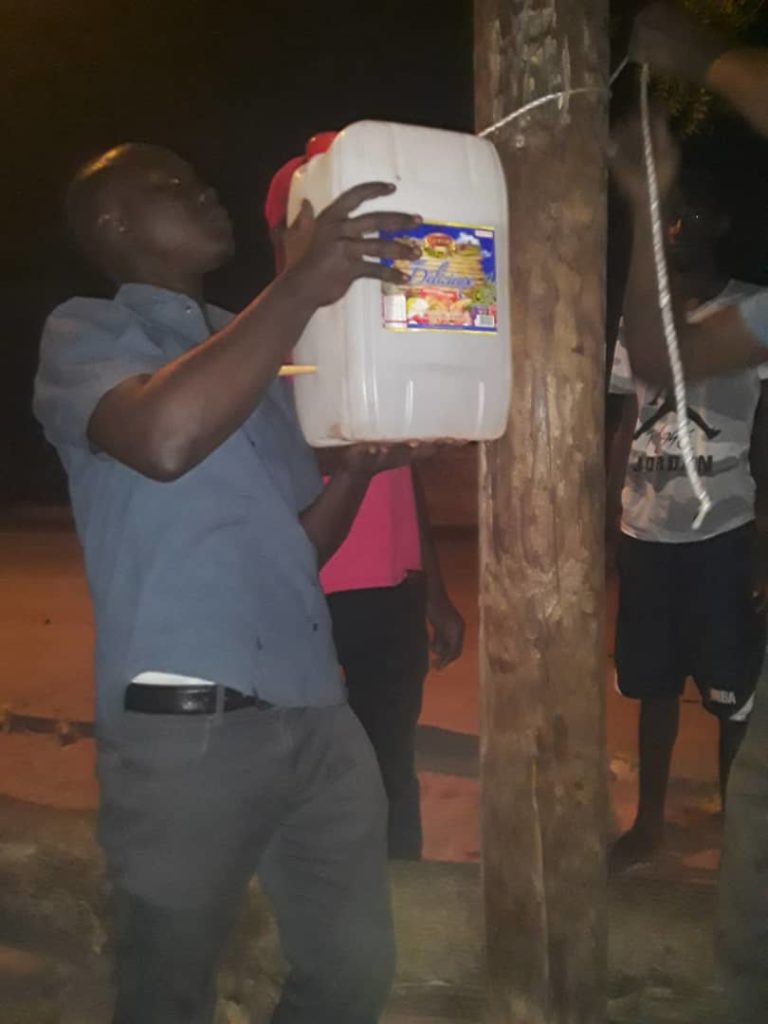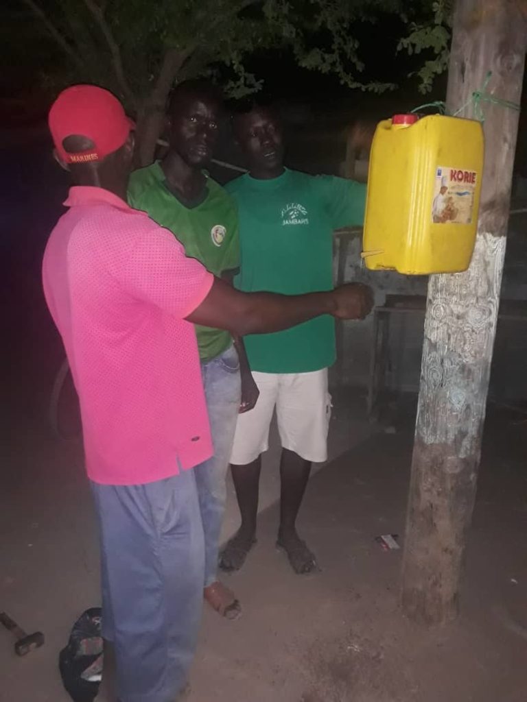 Des jeunes se sont portés volontaires au quartier Bouna Kane pour installer partout, des bidons d’eau remplis d’eau de javel et des détergents dans les lieux publics bien qu’ils ne sont plus fréquentés depuis quelques jours.
