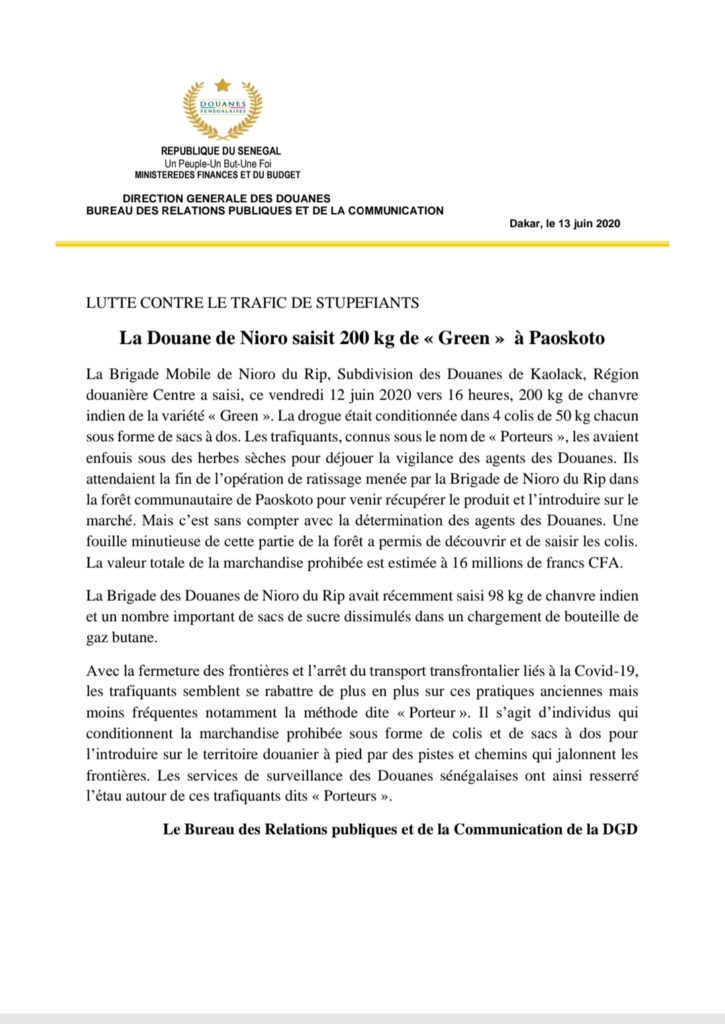 Ledakarois221- La Brigade Mobile de Nioro du Rip, Subdivision des Douanes de Kaolack, Région douanière Centre a saisi, ce vendredi 12 juin 2020 vers 16 heures, 200 kg de chanvre indien de la variété « Green ». La drogue était conditionnée dans 4 colis de 50 kg chacun sous forme de sacs à dos. Les trafiquants, connus sous le nom de « Porteurs », les avaient enfouis sous des herbes sèches pour déjouer la vigilance des agents des Douanes. Ils attendaient la fin de l’opération de ratissage menée par la Brigade de Nioro du Rip dans la forêt communautaire de Paoskoto pour venir récupérer le produit et l’introduire sur le marché. Mais c’est sans compter avec la détermination des agents des Douanes. Une fouille minutieuse de cette partie de la forêt a permis de découvrir et de saisir les colis. La valeur totale de la marchandise prohibée est estimée à 16 millions de francs CFA.