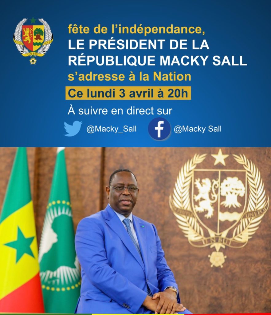 » Je vous invite à suivre en direct sur mes comptes officiels mon message à la Nation ce lundi à 20h00.À l’occasion de la célébration de la fête de l’indépendance, retrouvez le message du Président Macky Sall « .