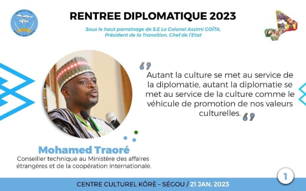 « Je remercie très chaleureusement les membres du Corps Diplomatique,Consulaire et les représentants des Organisations Internationales et Régionales qui se sont massivement déplacés à Ségou pour la Rentrée Diplomatique 2023 centrée sur la diplomatie culturelle », a dit Abdoulaye Diop, Ministre des Affaires Étrangères et de la Coopération internationale.