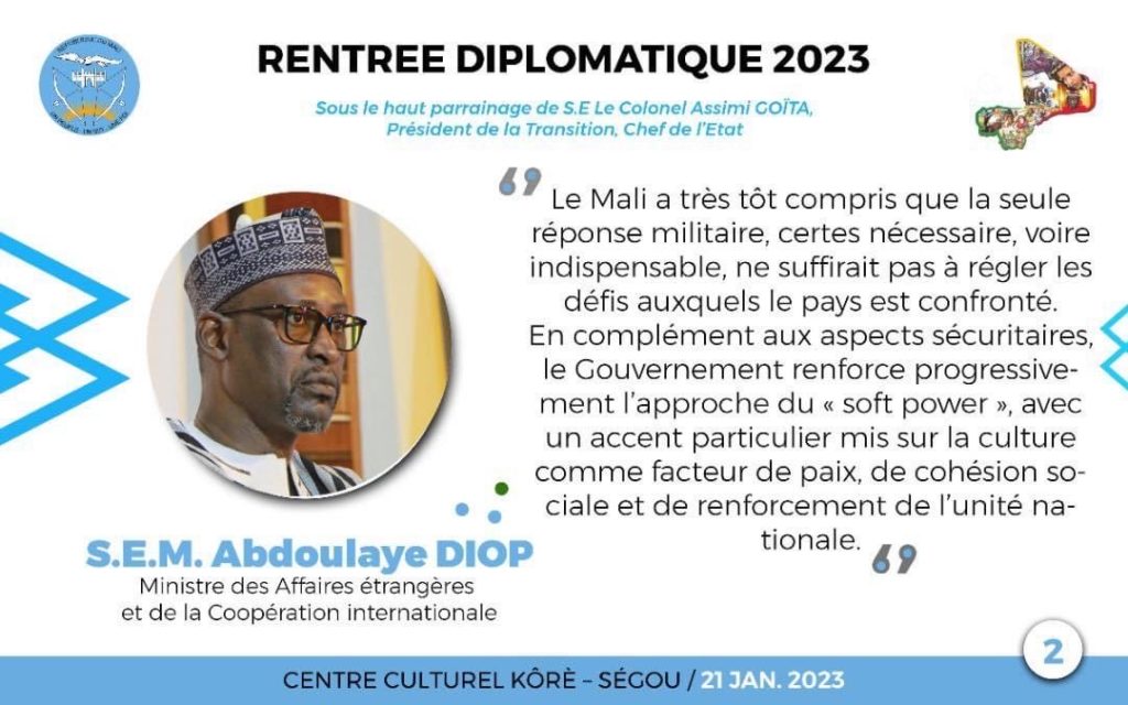 « Sentiments gratitude et de satisfaction aux autorités administratives, politiques &sécuritaires de la Région & de la Ville de Ségou pour l’hospitalité authentique & la réussite de la Rentrée Diplomatique 2023 en ce haut lieu de l’histoire & de la culture malienne et africaine », dit le chef de la diplomatie malienne.