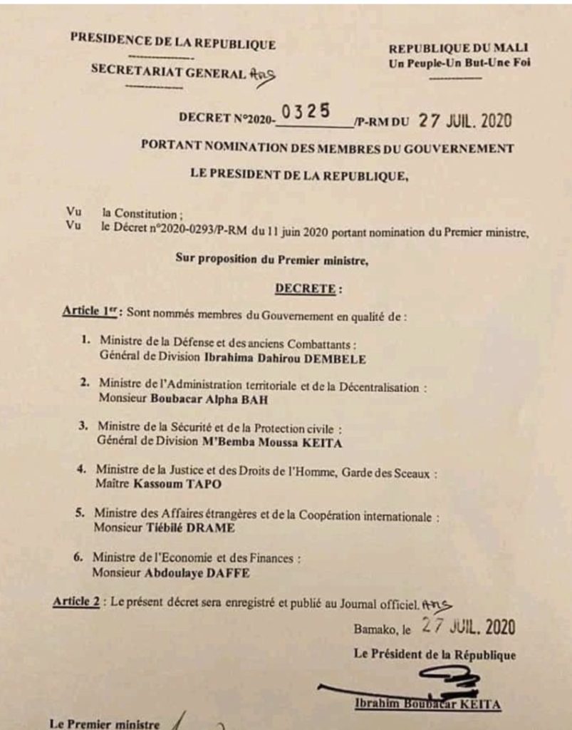 Suivant le decret numéro 2020/0325/P-RM du 27 juillet 2020, le poste de Ministre de la Défense et des Anciens Combattants est occupé par le Général de Division Ibrahima DEMBELE. De meme, le poste de Ministre de la Securité et de la Protection Civile est occupé par le Général de Division M’Bemba Moussa KEITA.