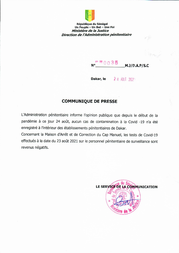 Hisséne Habré n’a pas chopé le virus en prison. À la suite du ministre de la Justice qui s’est exprimé , l’administration pénitentiaire confirme l’information dans un communiqué parvenu. Selon le document, depuis le début de la pandémie à ce jour 24 août, aucun cas de contamination à la Covid-19 n’a été enregistré à l’intérieur des établissements pénitentiaires de Dakar. « Concernant la maison d’arrêt et de correction du Cap Manuel, les tests de Covid-19 effectués à la date du 23 août 2021 sur le personnel pénitentiaire de surveillance sont revenus négatifs », précise le document