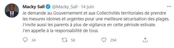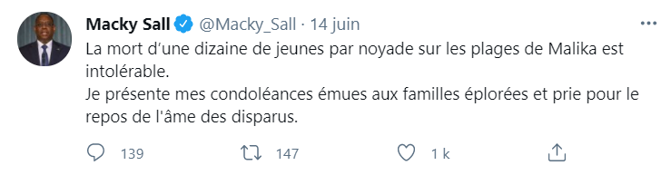 « La mort d’une dizaine de jeunes par noyade sur les plages de Malika est intolérable. Je présente mes condoléances émues aux familles éplorées et prie pour le repos de l’âme des disparus », a twitté Macky Sall.