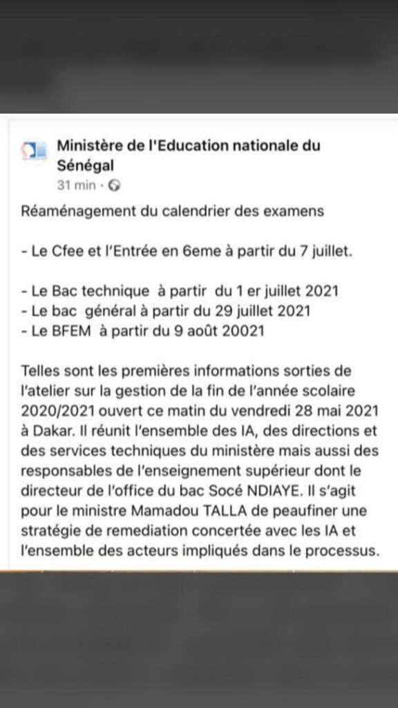 Le Baccalauréat général est prévu le 29 juillet 2021, le Baccalauréat Technique est prévu le 1er juillet 2021, le BFEM Brevet de Fin d’Etude Moyen le 9 Août 2021, le CFEE, Certificat de Fin d’Etude Elémentaire; les 6 et 7 juillet 2021.