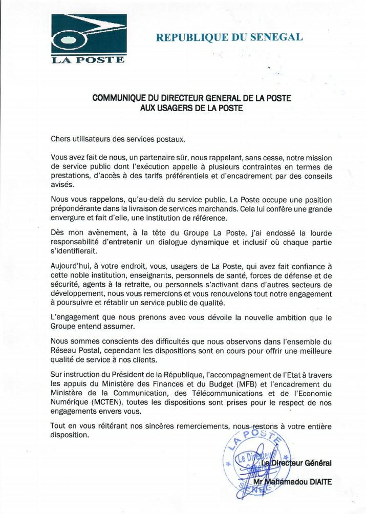 Suite à sa prise de fonction, le nouveau Directeur Général de la Poste, Mamadou Diaité, rappel à travers un communiqué à tous les utilisateurs de la poste que cette dernière à une mission de service public. Il souligne en même temps que la Poste occupe une position prépondérante dans la livraison de services marchands. Cela lui confère une grande envergure et fait d’elle, une institution de référence. De plus, il déclare que sa nomination entre dans le cadre d’un dialogue inclusif regroupant les différentes parties prenantes….