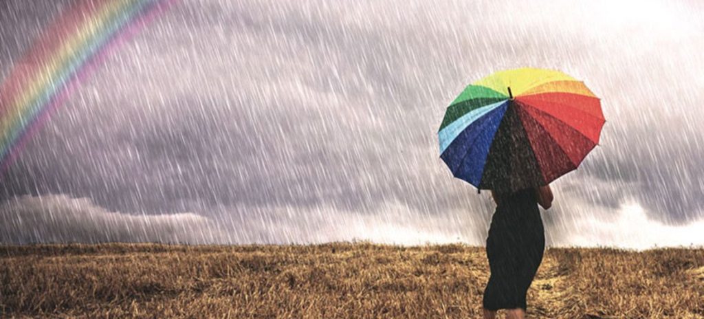 Une femme avec un parapluie marche sous la pluie dans un champ