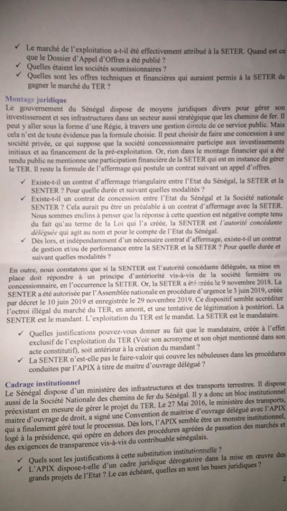 Le Ter et toutes les dépenses afférentes ont coûté au contribuable sénégalais la bagatelle de 780 milliards. En plus de de ces investissements initiaux, l’exploitation du TER va brasser des sommes colossales en termes de chiffres d’affaires et de dividendes à redistribuer à des privés. L’exploitation du TER est un marché public qui postule un appel à concurrence. Or, à ce jour, aucune information n’est fournie au public sénégalais sur les conditions d’octroi d’un tel marché. Le site internet de l’APIX mentionne un Marché dénommé M6, relatif à la « Maintenance et l’exploitation du TER » au cours de l’année 2018. Nous n’avons vu aucune trace de la passation de ce marché qui, vraisemblablement, est en train d’être exécuté par la Société privée SETER. Le marché de l’exploitation a-t-il été effectivement attribué à la SETER. Quand est ce que le Dossier d’Appel d’Offres a été publié ? Quelles étaient les sociétés soumissionnaires ? Quelles sont les offres techniques et financières qui auraient permis à la SETER de gagner le marché du TER ?