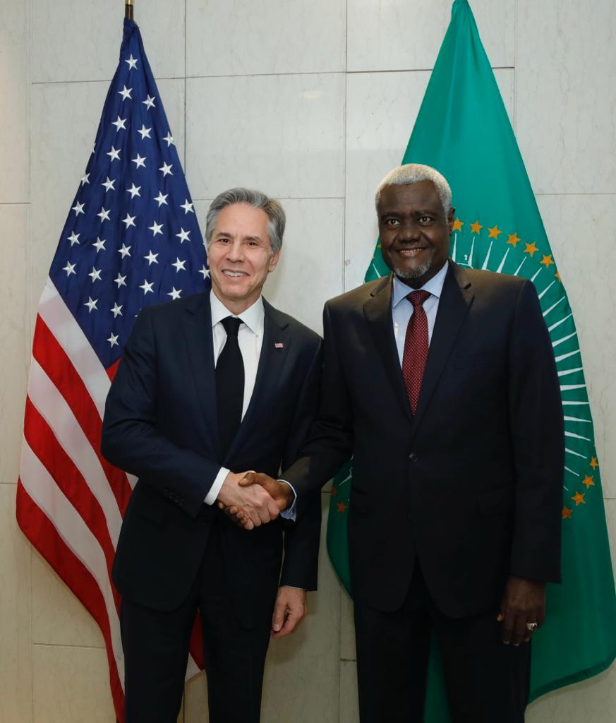» J’ai eu le plaisir de recevoir le secrétaire d’État américain Antony Blinken au siège de l’UA lors de sa visite de travail à Éthiopie. Nous avons échangé des vues sur les progrès de la mise en œuvre de l’accord de cessation des hostilités et sur d’autres questions régionales d’intérêts commun ».