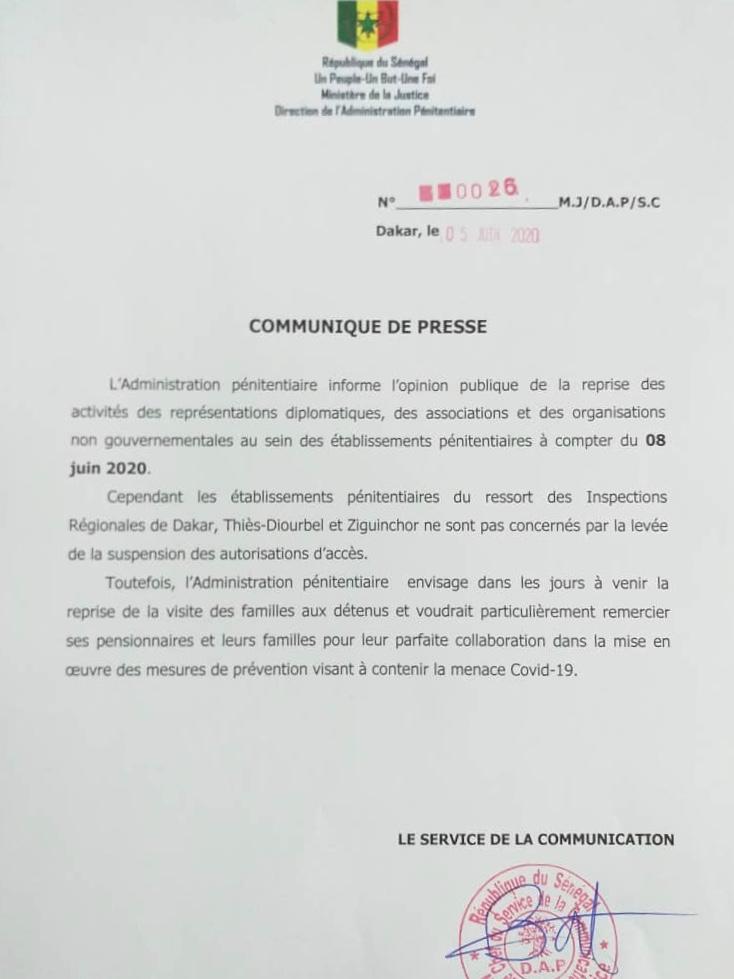 Ledakarois221- Dans un communiqué reçu à D221, l’administration pénitentiaire informe de la reprise des activités dans les établissements pénitentiaires du pays à compter du 8 Juin 2020.