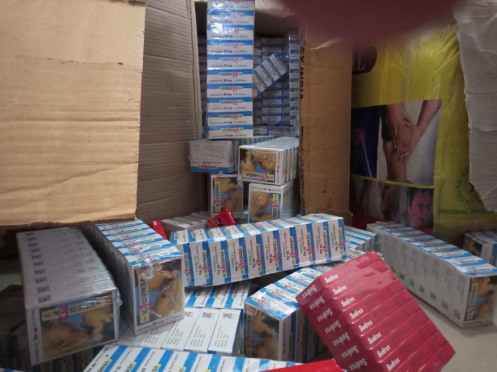 L’opération visant à boucler les réseaux de receleurs et commanditaires de ce trafic criminel s’est déroulée les mardi 24 et mercredi 25 mai 2022 entre les zones maritimes de Thiaroye-Guédj et le quartier Thiaroye-Gare. Le coup de filet a d’abord permis aux agents des Douanes d’intercepter un véhicule « taxi bagages » bourré de colis suspects le mardi 24 mai 2022 vers 4 heure du matin à Thiaroye-Guédj et d’appréhender deux individus dont un qui s’est présenté comme étant le propriétaire de la cargaison. Le contrôle des colis a permis de découvrir qu’il s’agit de grosses quantités de médicaments dont le conditionnement et l’humidité ne laissent aucun doute sur le fait que la marchandise a d’abord été transportée par voie maritime. L’interrogatoire des deux prévenus et les enquêtes menées par la suite ont permis la localisation du dépôt de destination de ladite marchandise aux environs du Marché de Thiaroye dans un endroit communément appelé Parc-Rénn. Les agents qui se sont déportés sur les lieux ont constaté, en présence du propriétaire, l’existence d’un stock de plusieurs cartons, sacs et autres contenants de médicaments.
