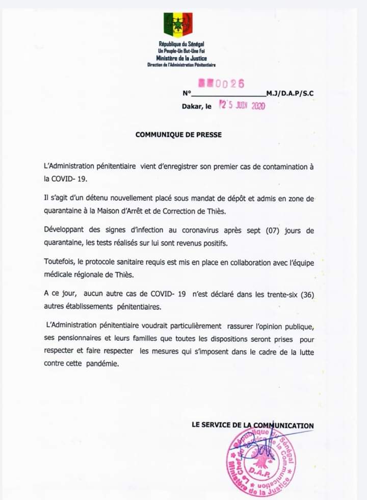 Ledakarois221- Dans un communiqué parvenu à D221 nous apprenons le premier cas de Covid-19 enregistré au sein de l’administration pénitentiaire sénégalaise. Selon le document, il s’agit d’un détenu placé sous mandat de dépôt et admis en zone de quarantaine à la maison d’arrêt et de Correction de Thiès